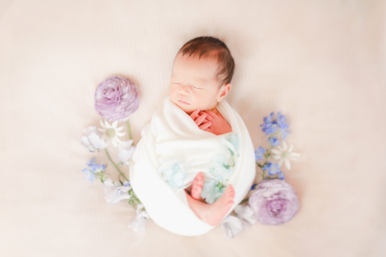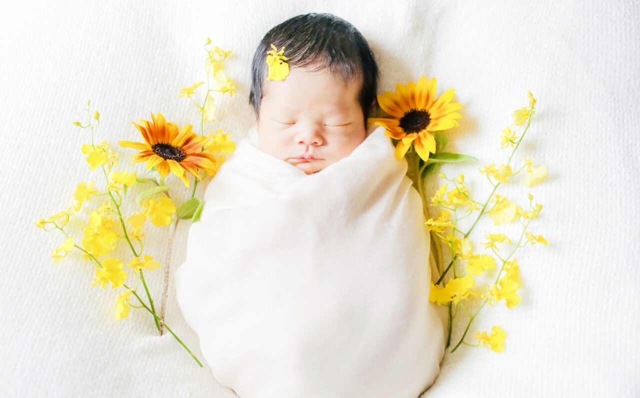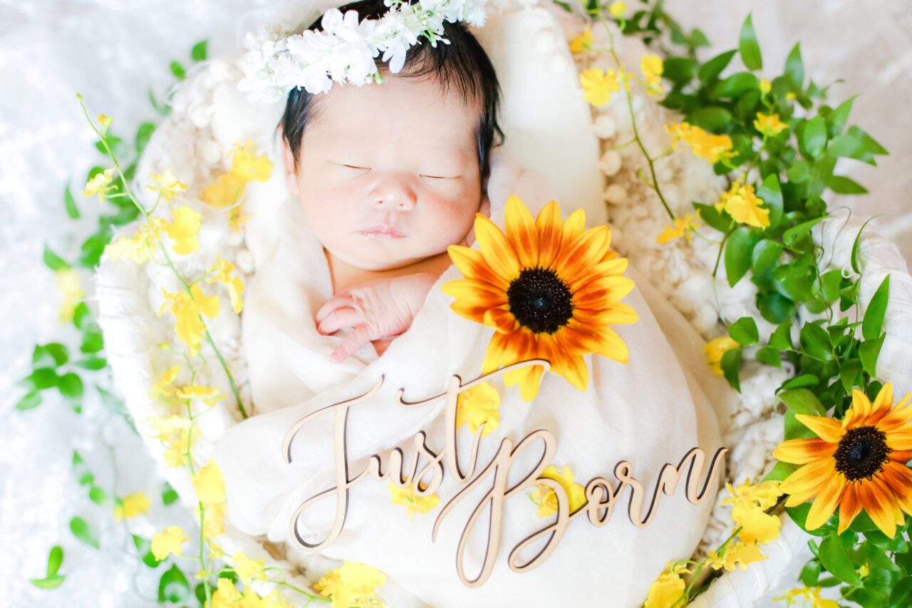 新鮮なお花をプラスするだけでとっても華やかなニューボーンフォトになりますよ^^
