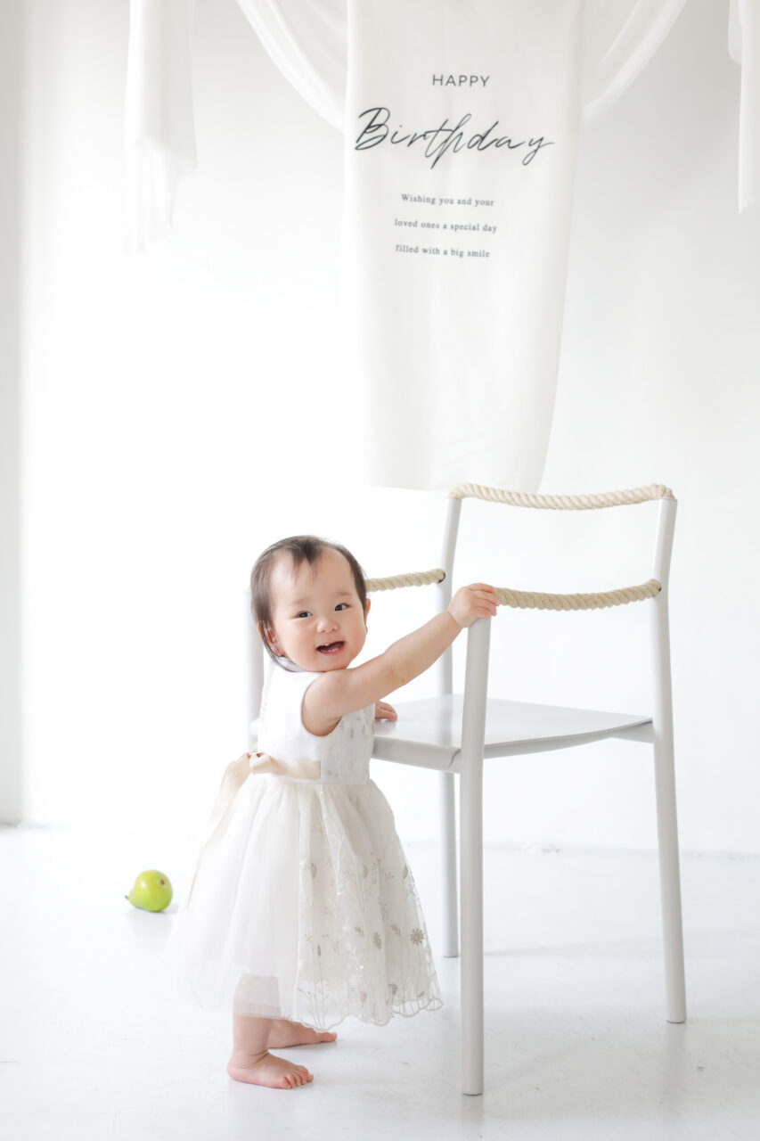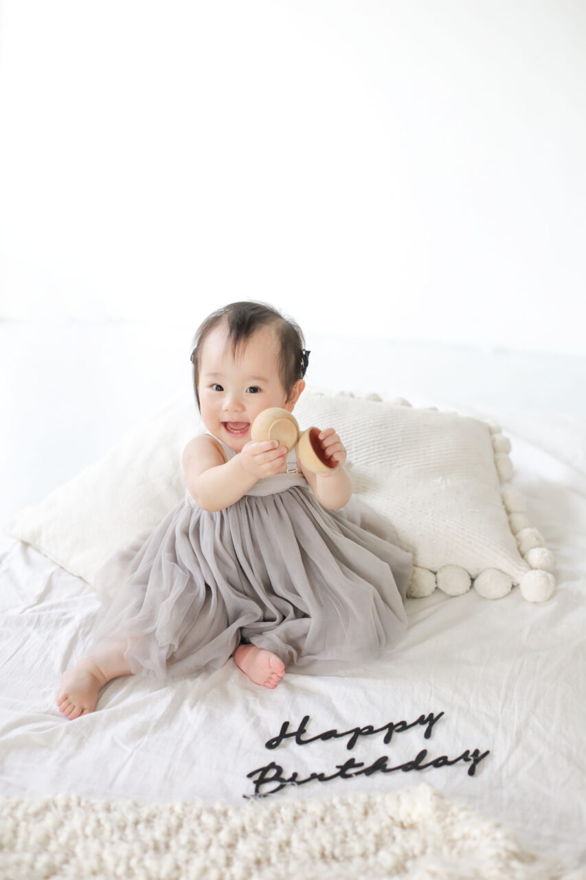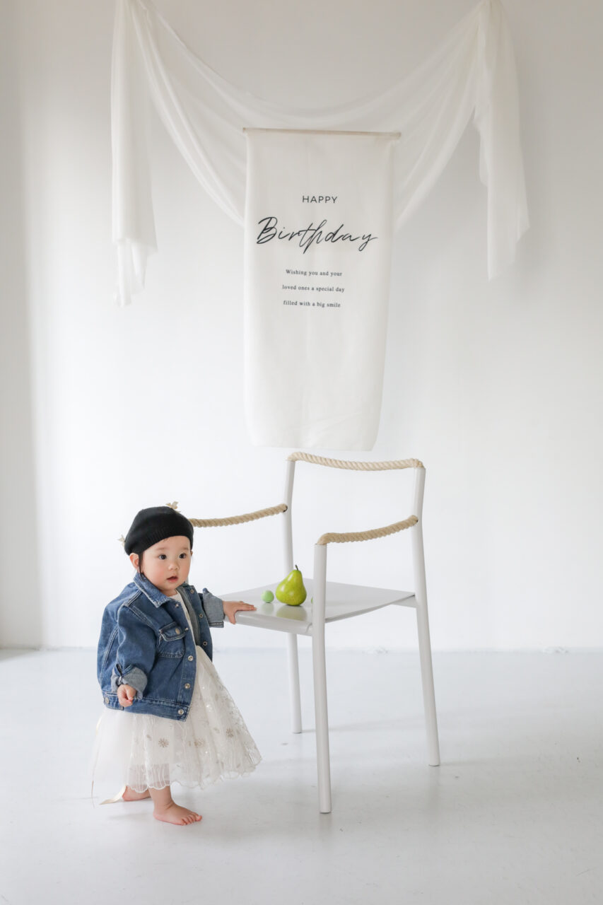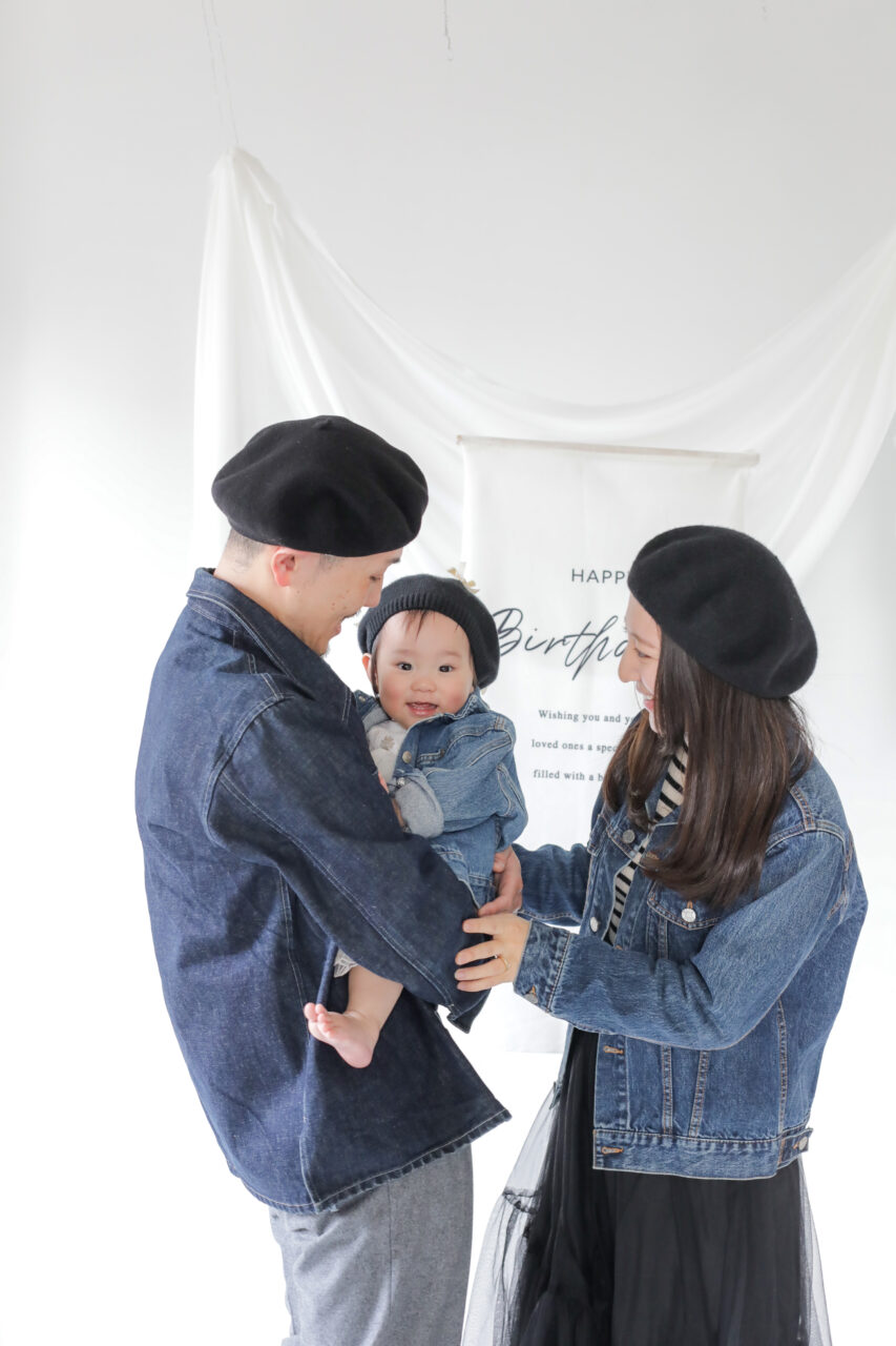 Galleryギャラリー 1歳女の子バースデーフォト パパママと一緒にデニムコーデでお越しいただきました♪ ベレー帽コーデもとっても似合ってたよ* プライベート空間なのでお着替えにぐずっても大丈夫です! お子様のペースに合わせて撮影できますので ご安心ください*
